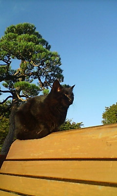 ご近所の日常風景の一部となっているにゃんこ達。こんなに近くまで寄れるのは稀で、いつもは半径1メートル位で逃げられてしまうのですが、野良にゃんこなのか飼いにゃんこなのか分かりませんが、このにゃんこはなかなか肝が据わってらっしゃるよう。暖かい朝の日差しをベンチでご一緒させて頂きました。黒い毛並みと金色の目の美人さんでした。